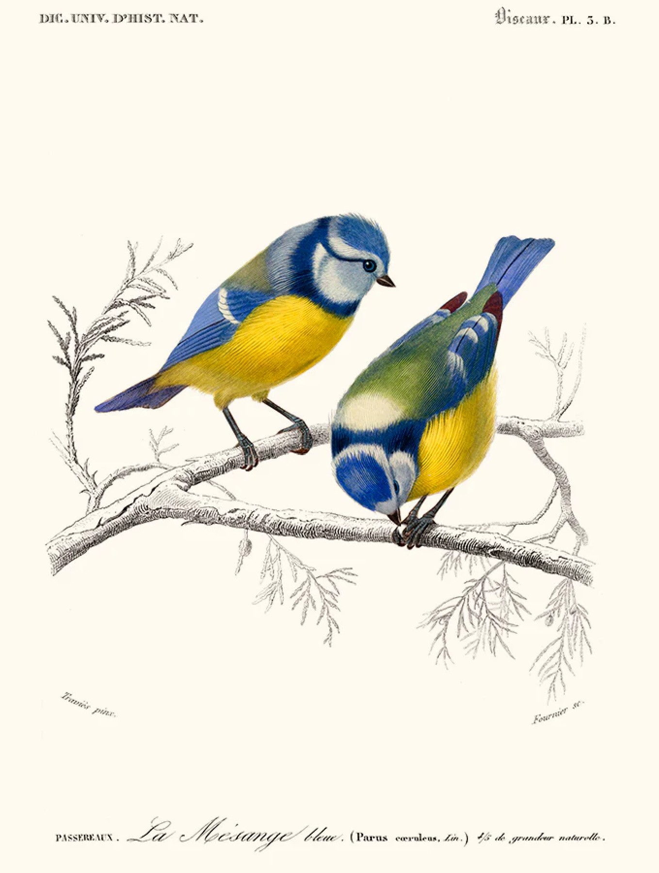 Image : Mésange bleue, extrait du Dictionnaire Universel d’Histoire Naturelle de Charles Henry Dessalines d’Orbigny (vers 1841).